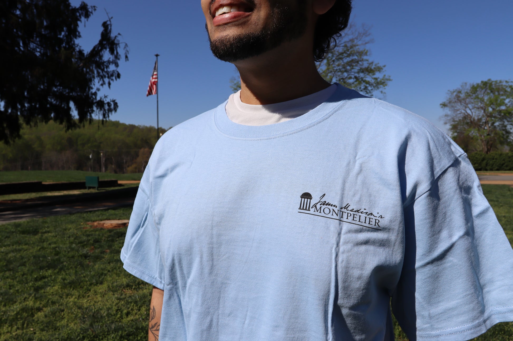 This light blue T-shirt features a scenic image of James Madison’s Montpelier, the historic Virginia estate of the fourth U.S. president. The back graphic centers on the iconic “We the People Love” sign, a well-known feature of the Montpelier grounds, set within a pastoral landscape with traditional fencing. Madison’s house appears in the far distance, anchoring the scene and connecting the design directly to the historic home. Finished with “James Madison’s Montpelier” in classic script and serif lettering, this shirt offers a timeless and authentic tribute to the site’s history and identity.